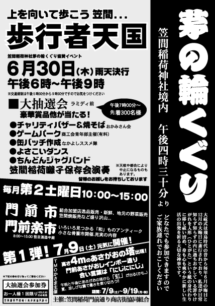 2011年6月30日(木)に行われた神事「夏越しの大祓式・茅の輪くぐり」と笠間稲荷門前通り商店街協同組合の協賛イベントの一部をご紹介します。