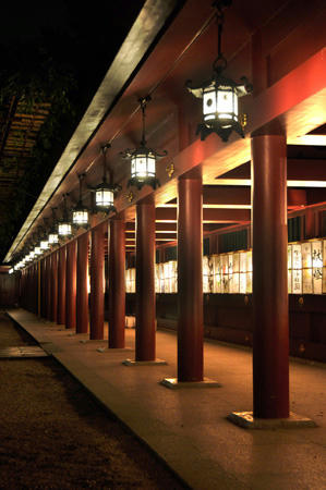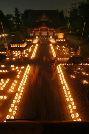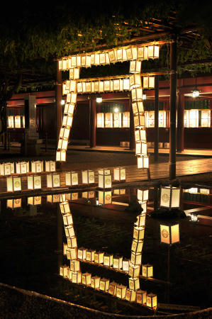境内の石燈籠や釣燈籠、そして奉納行灯全てに灯がともされ、夕暮れとともに風情ある景観がご覧いただけ、夜遅くまで参拝者で賑わいます。