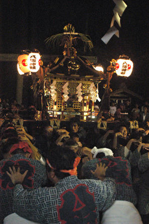 午後6時半には石井神社から本神輿が出発します。その後、門前通り商店街へやってきます。午後9時過ぎには八坂神社へ宮入しますが、その間の勇壮な担ぎ手の姿を是非ご覧ください。