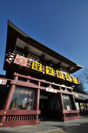 笠間稲荷神社の壱の鳥居をくぐると、今年の干支の描かれた横断幕が目をひきます。清々しい気持ちで参道(参道真ん中は神様の通り道ですので歩いてはいけません)を歩いていくと目の前には立派な萬世泰平門があります。