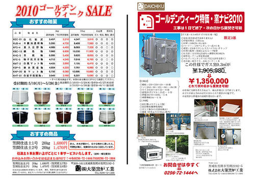 釉薬セールは片面フルカラー1000枚で印刷代4600円。ゴールデンウィーク特価・窯ナビ2010は片面フルカラー・裏面モノクロ1000枚で印刷代5900円(両方とも代引き手数料込み、版下作成費別途)となっております。