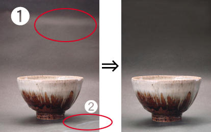 撮影にあたり、背景にRをつけて撮影をしましたが運悪く、写真(1)にあるように上の方にシワが入ってしまいました。また器の右側に擦れた傷(2)もあります。