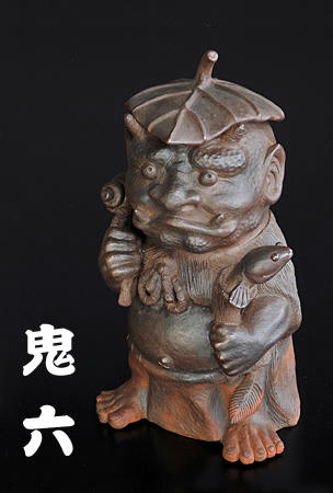 笠間焼の中でも数少ない陶人形作家の井上 卓氏(大築窯炉工業さんのニュースレター第8号トップ記事)の作品です。焼き〆という技法で創られた、渋い雰囲気が漂う『鬼六』さんです。