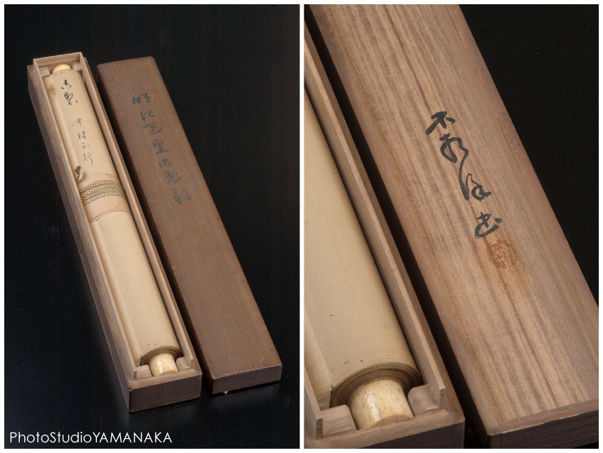 また、乾燥しきっているので開くとポロポロと紙がはがれ落ちる始末。とりあえず写真にだけは撮っておこうと慎重に開きパチリ! 共箱も焼けた感じはいいもののずいぶんと痛んでいる。