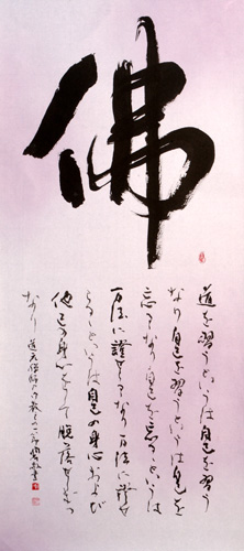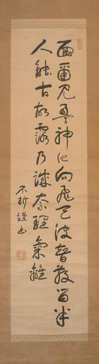 中村不折は明治、大正、昭和にわたり洋画界と書道界の二つの分野において大きな足跡を残した人物である。明治34年にフランス留学をし、人物画を学び綿密な構図をもとに躍動的な力強い写実主義を確立した。書に関しては北派の書をもとに不折独自の大胆で斬新な書風を展開したことで知られている。