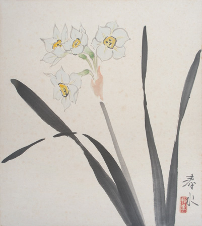 ここに描かれているのはスイセンの花。わたしはあまりこういった日本画を観る目は確かではありませんが、実際に観ていると何となくですが心が癒されるような気がします。これは多分、絵の時代的にみて私の先先代が好きで集めていたもののようです。