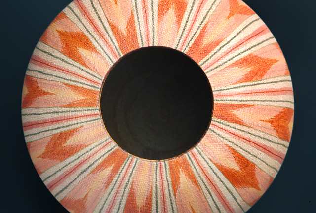 福野道隆氏の赤絵絣文壺の上面から撮影したもの。パンフレットの