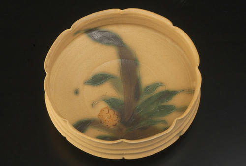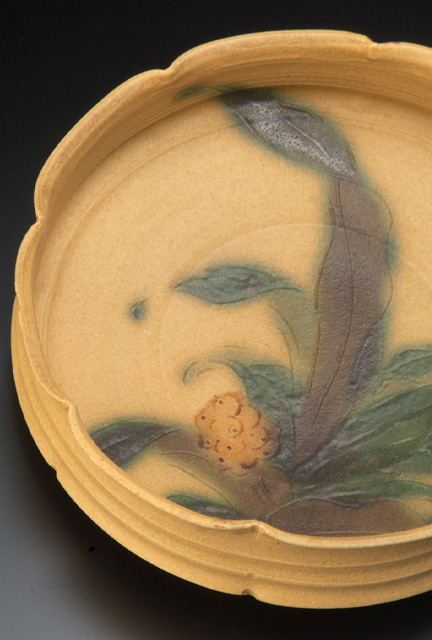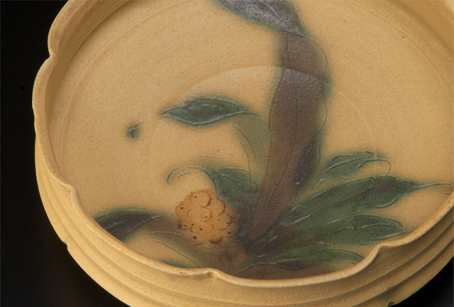 題名は「黄瀬戸萬年青文輪花鉢」。今回の撮影は、白いホリゾント