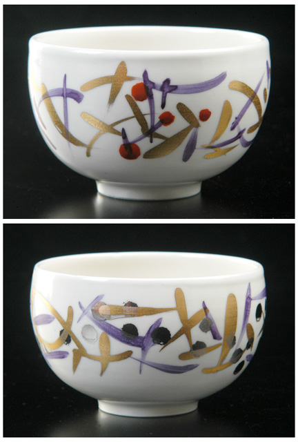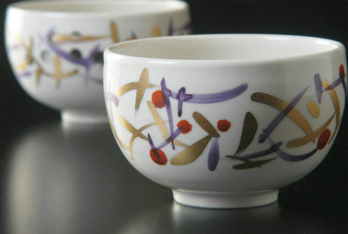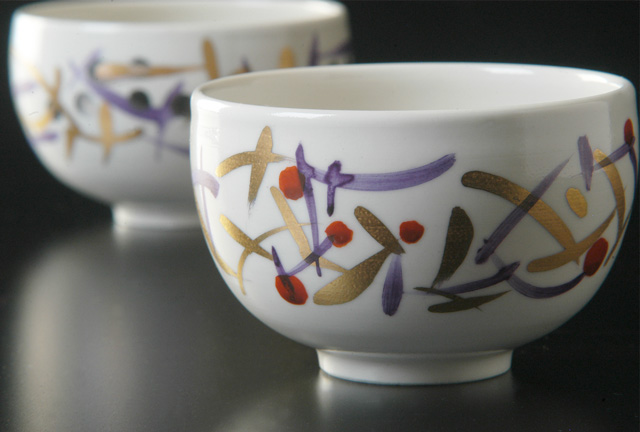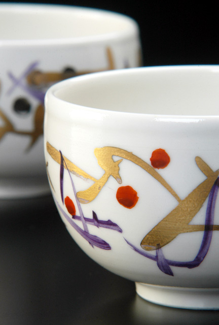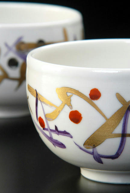 滑らかな肌の真っ白い湯のみに金や赤、青の模様が入っています。