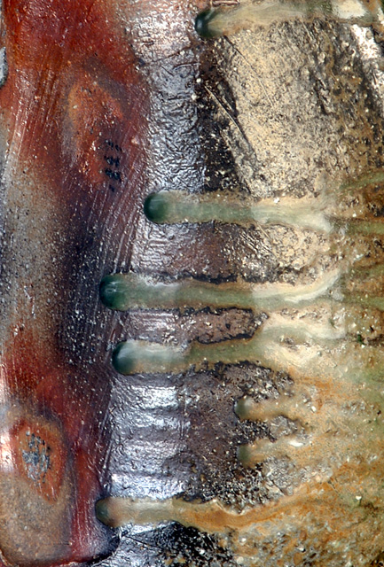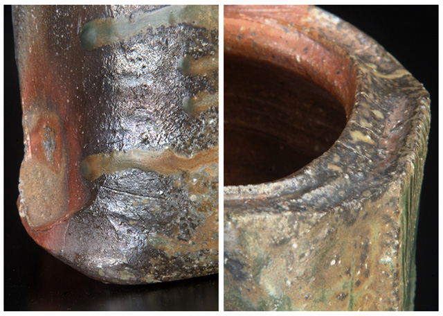 下の写真は穴窯による焼成で、灰が溶けて流れた部分が緑色を呈している。