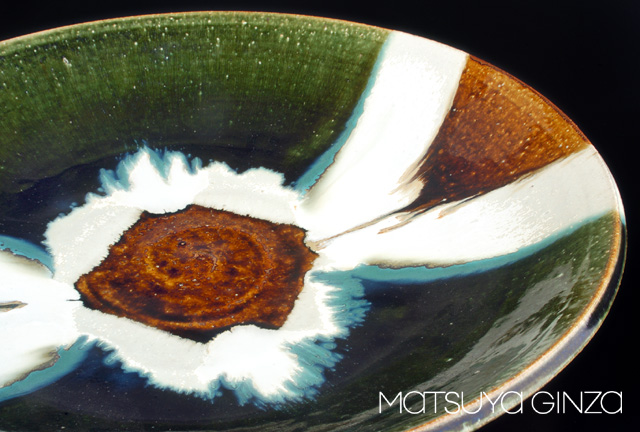 緑釉と飴釉の掛け分けやさびた鉄の様に黒いはん点のでた柿釉