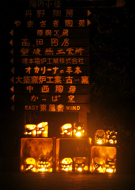 中写真も毎年行われる「十六夜まつり」の際に陶の小径にある店舗案内看板と筒灯りと一