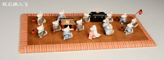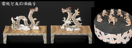 絣文で有名な福野氏がつくった台に、高橋さんの可愛い表情の「きつね」や「おに」たち。とても微笑ましい雰囲気がいっぱいで、心が癒されます。変わって「雲竜」は凛々しい面持ち。小さな五月人形やお雛様を作ってきた、高橋さんの今回の作品も最高に可愛いです。 私は一足先に見てしまいましたがこの愛らしい表情は、是非会場でご覧いただきたいと思います。