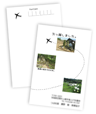 で、ついでではないのですがお引っ越しの案内状も作成させていただきました。こちらは落ち着いた雰囲気のマット紙を使用しました。切手部分のツバメの絵は作家さんご自身が描いたものを入れました。