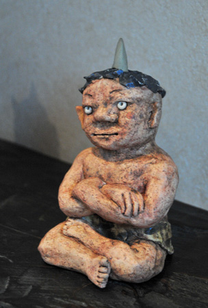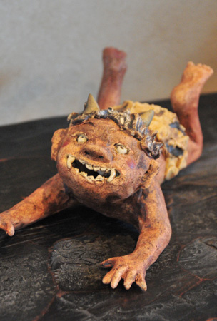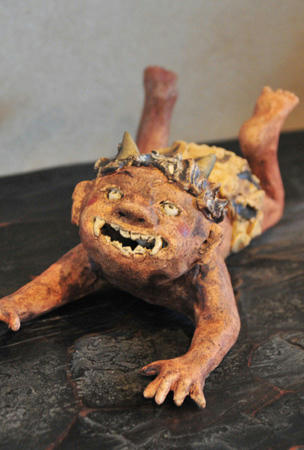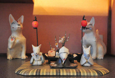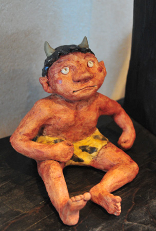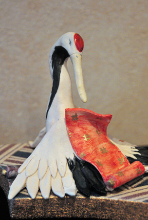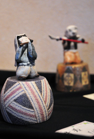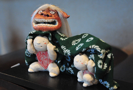 会場に入ると、そこはもう「おとぎ話」の世界! 愛らしい鬼がお相撲をしたり、酒盛りをしている。あっちへ行ってみると、鶴の恩返しのシーンがあったり、弁慶と牛若丸もいます。見ているだけで心を和ませてくれるものばかり。