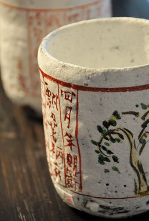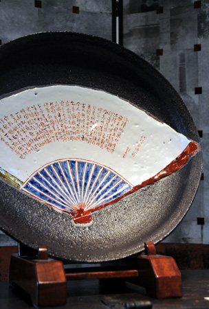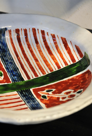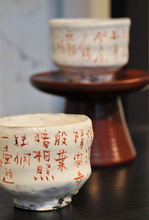 先日会場に行って、私の目に飛び込んできたのは河野氏独特の漢詩を器に描いたものでした。良寛から中国の詩人の漢詩を描いたこの作品は、読むことすらできないにしても興味があります。