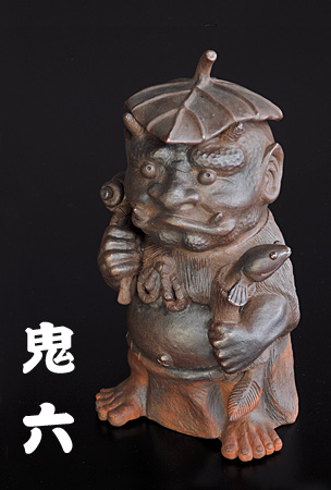 笠間焼の中でも数少ない陶人形作家の井上 卓氏(大築窯炉工業さんのニュースレター第8号トップ記事)の作品です。焼き〆という技法で創られた、渋い雰囲気が漂う『鬼六』さんです。