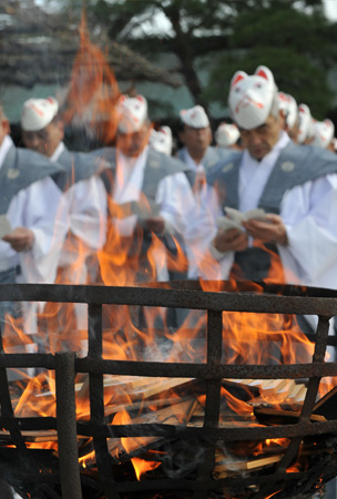 氏子総代、笠間稲荷青年会、笠間稲荷囃子保存会他の参列の下、炎上祭が進行していきます。絵馬が炎上する様はとても勢いよく、感動的です。