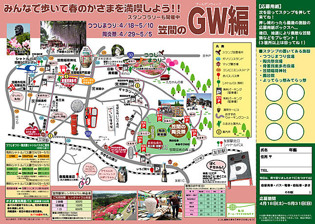 笠間のつつじまつり開催日からゴールデンウィークを含む5月31日(日)まで、下記の施設を3箇所以上回ってスタンプを押してこられた方を対象に抽選で、素敵な笠間焼などをプレゼント!!
