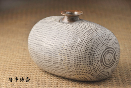 久々の飯野氏の陶展です。まるで骨董品のような古陶磁が大好きな飯野氏の今回の作品は俵壺。DM用写真は、骨董市で買ってきた木製のおか持ち(四角バージョン*丸バージョンもあります)の蓋の上で