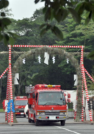 直径6メートルの茅の輪は日本一のサイズ。午前10時から茅の輪くぐり神事が斉行され、その後次々とパトカーや消防車、一般の車が交通安全を願って輪をくぐった。