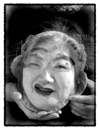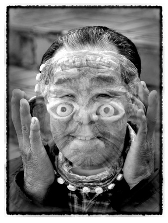今回のお年寄りの展示写真は私が撮影させていただき、出町氏の感性を反映しながら、お年寄り本人作の土面に本人の顔を透かし合わせて作成しています。