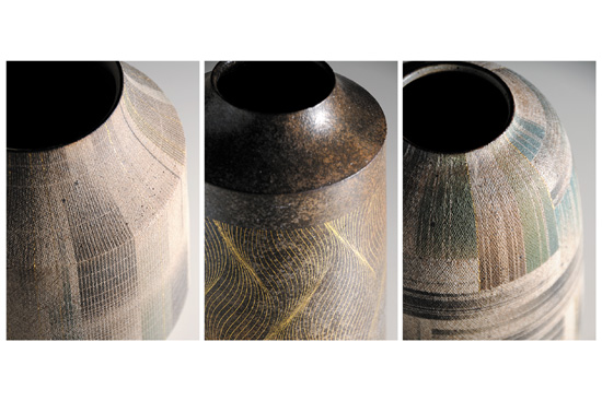 作品名:左/布目彩色花器・中/金彩花器・右/布目彩色花器